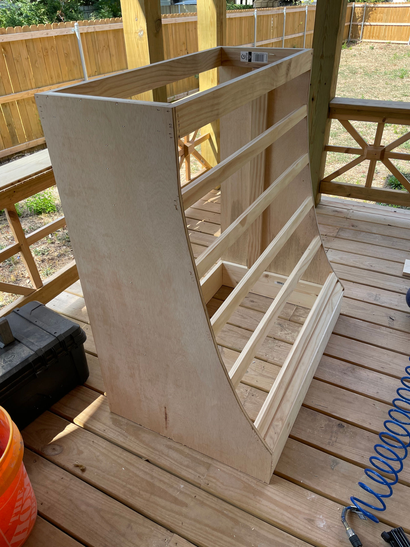 My own design built with 1x2's, 1x4's, 1/2" and 1/8" birch plywood veneer. Stock corbels, custom paint and wallpaper finish.